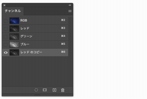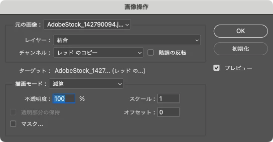 チャンネルパネルで「演算」または「チャンネル減算(R−G など)」を実行し、新しいチャンネルを作成
