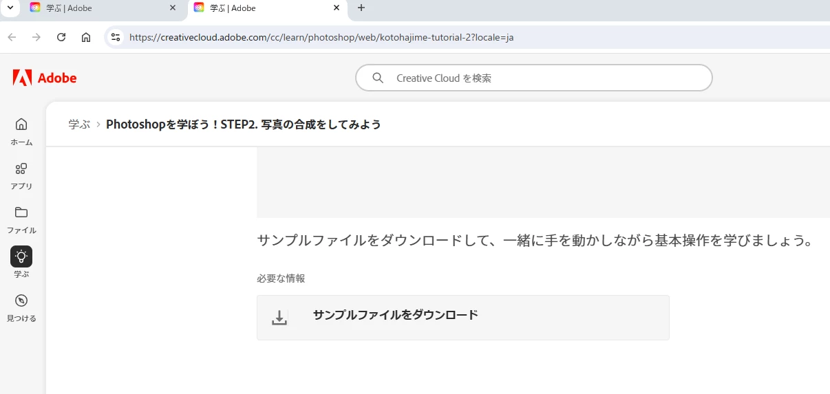 チュートリアルの「Photoshopを学ぼう Step2 写真の合成をしてみよう」のサンプルファイルが見つかりません。Step1のサンプルファイルは概要欄にあったのですが、Step2のサンプルファイルが見つかりません。どなたかご存知ないでしょうか?