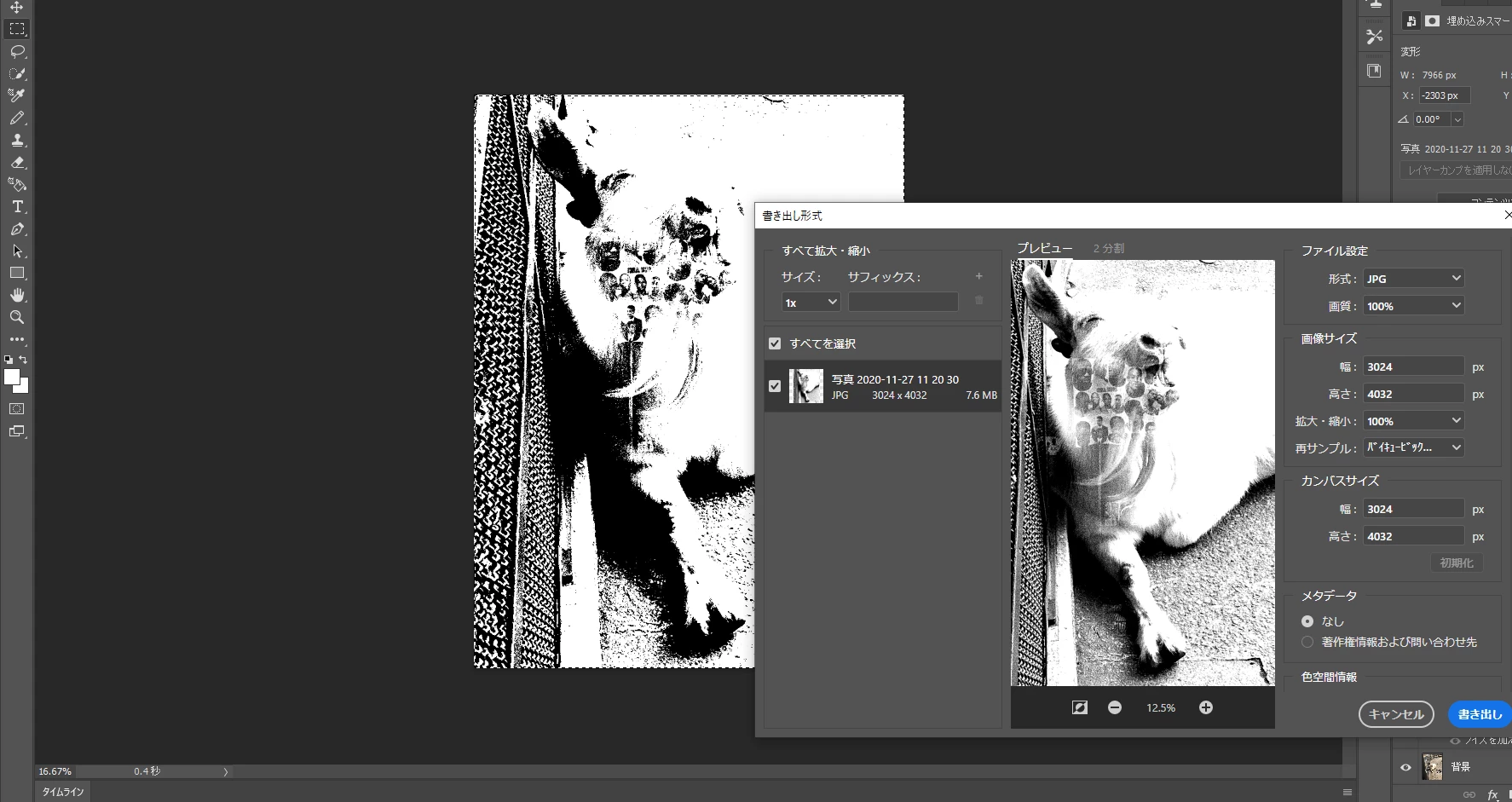 ササノ57_2ParticipantForum|Forum|4 years agoApril 19, 2021質問「ノイズを加える」→「二階調化」の手順を行ったときにうまく書き出されませんForum|Forum|4 years agoApril 19, 2021返信数 1.461 ビューPhotoshopでの画像編集で「フィルター」→「ノイズ」→「ノイズを加える」でノイズを加えた後に「イメージ」→「色調補正」→「二階調化」で二階調化したいのですが、編集中の画面ではうまくできているのですが、書き出す際、添付した画像のようにグレースケールのような状態で書き出されてしまいます。この問題を解消する方法はありますでしょうか?windows10です。よろしくお願いします。macOSWindows