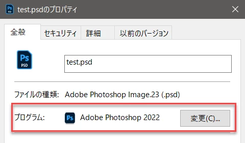 また、PSDファイルを右クリック>プロパティの画面から、「プログラム(関連付けの設定)」を変更することで、PSDファイルをダブルクリックして起動するプログラムを変更できます。