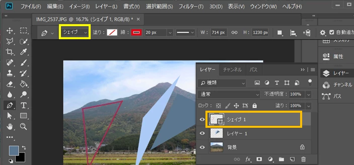 レイヤー1にある画像上でペンツールを用いて三角形を描き、
