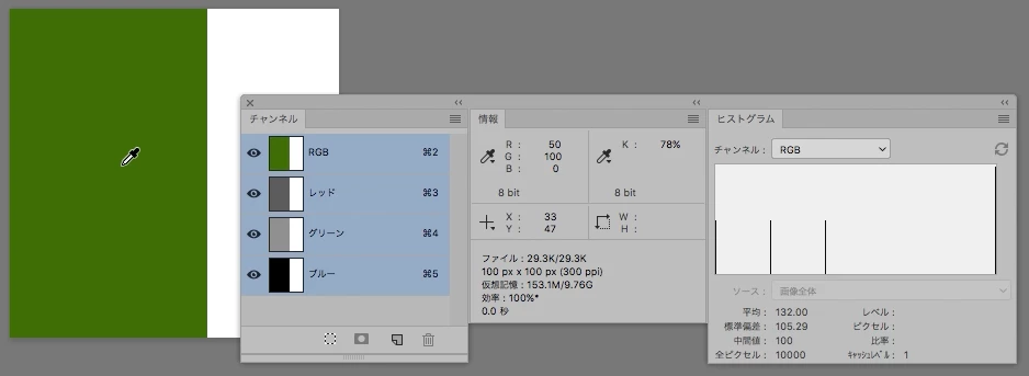 Photoshopのヒストグラムに載っている数値情報の算出方法について質問です。