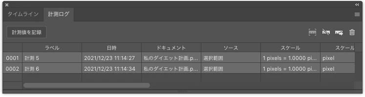 計測ログパネルで計測値の行を選択、右端のゴミ箱の隣の「選択した計測値を書き出し」ボタン、