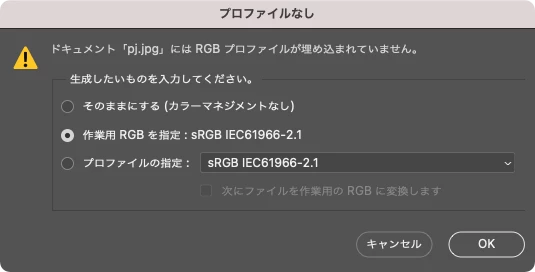 Photoshop Ver25.5.1(Windows版)ですが、ファイルを開く時、プロファイルなし等のメニューで「生成したいものを入力してください」になっています。Illustrator(Ver28.3)では「処理方法を指定してください」です。間違いですかね?