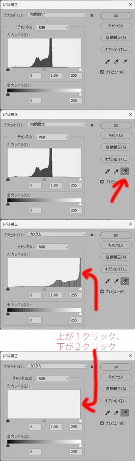 「黒白にして」とありますが、これはピクセル各チャンネルごとにピクセルの濃度 244 以下を0に引き下げてプレビューできるものですね。255 だけはそのままなので、調子が残っているか完全に飛んでしまっているか判断することができます。今回のように背景を白く飛ばす目的には適っています。