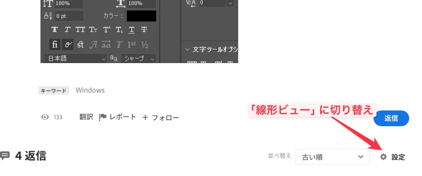 ここを線形ビューにしておくと、同じ返信をいくつも書き込む手間が減ります。