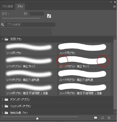 ブラシの表示が今までは先端が細くなっているものもあったのですが、急にすべて同じ太さの表示になってしまいました。(画像で丸印つけている箇所です)