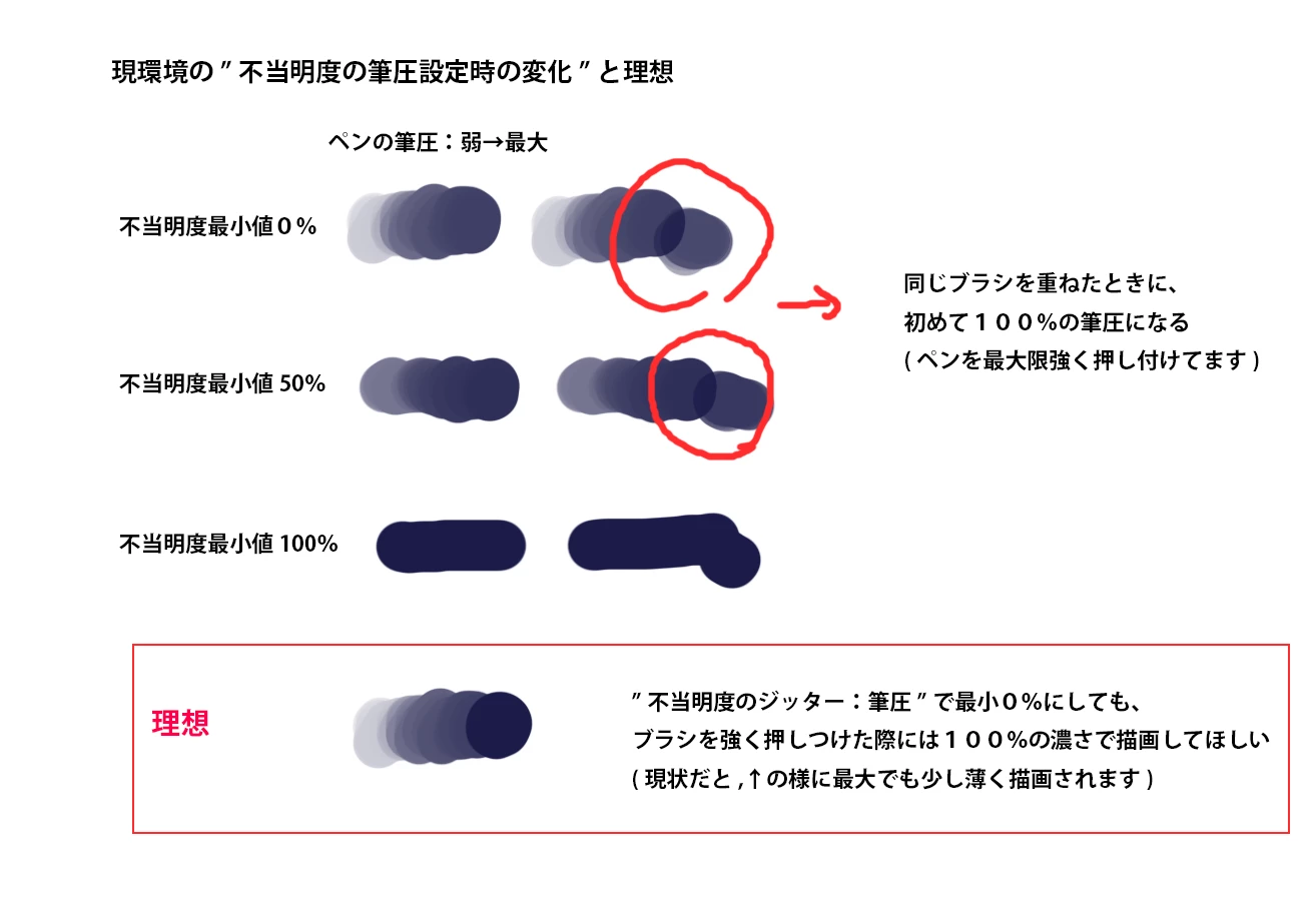 不透明度に筆圧を設定して強くブラシを押し付けた際に、100%の濃さで描画する方法はありますでしょうか?(もしくは、不当明度のジッター:筆圧を設定した時の最大値の挙動は、薄くなってしまうものなのでしょうか?)
