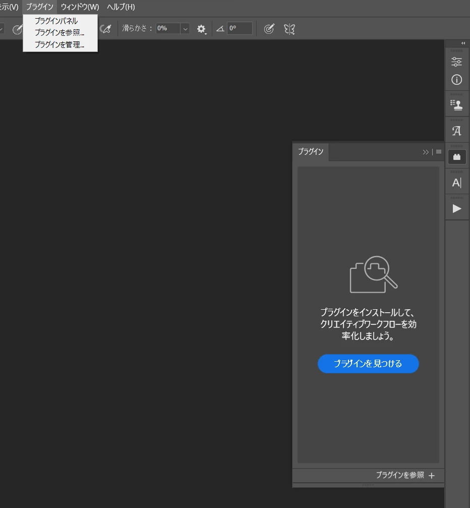 と言うか、Photoshopのプラグインタブをクリックしても、「プラグインパネル」「プラグインを参照」「プラグインを管理」と言う3項目しか出てきません。