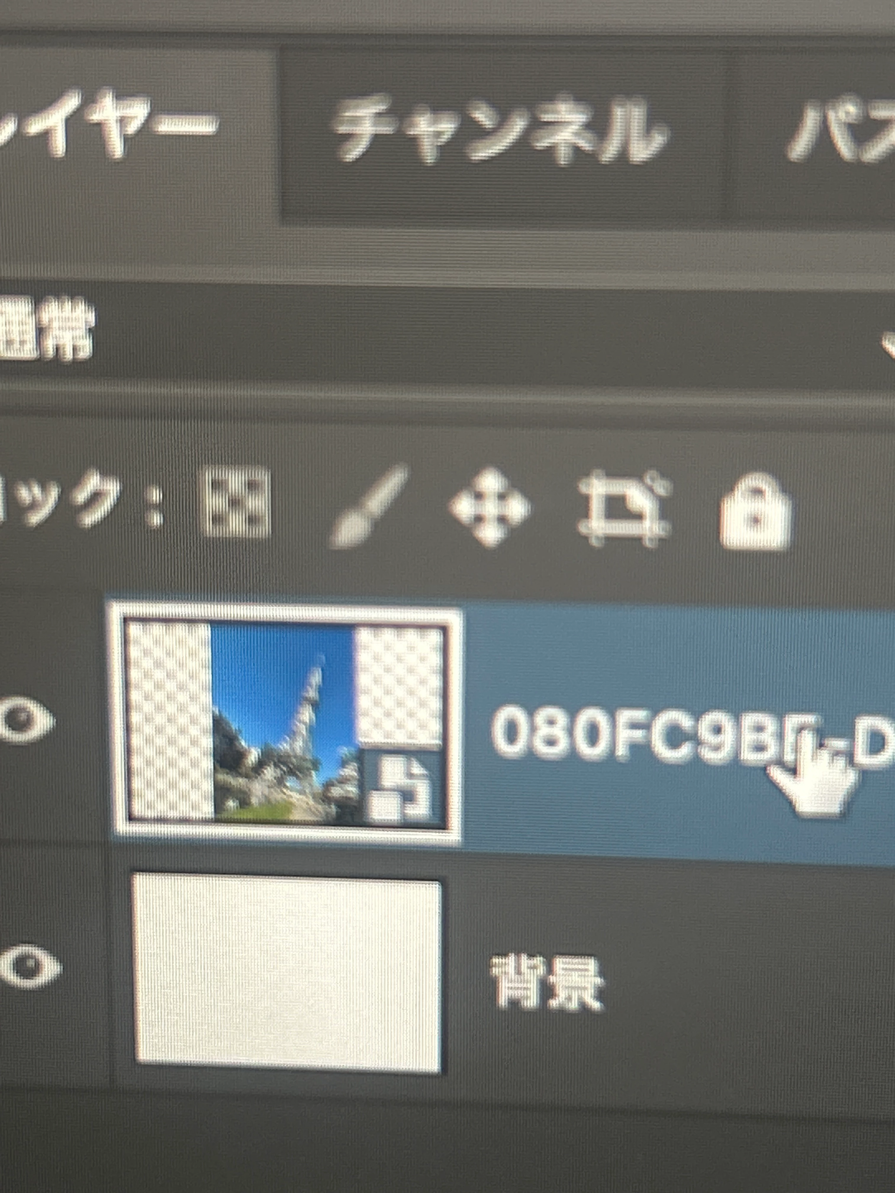 マークの上にカーソルを合わせてしばらく待つと「スマートオブジェクトサムネール」と出ると思います。鉄塔の写真が単独のコンテンツとして編集可能である(スマートオブジェクトである)という意味のマークです。鉄塔のレイヤーのコンテキストメニューの「レイヤーをラスタライズ」で通常の画像レイヤーになります。