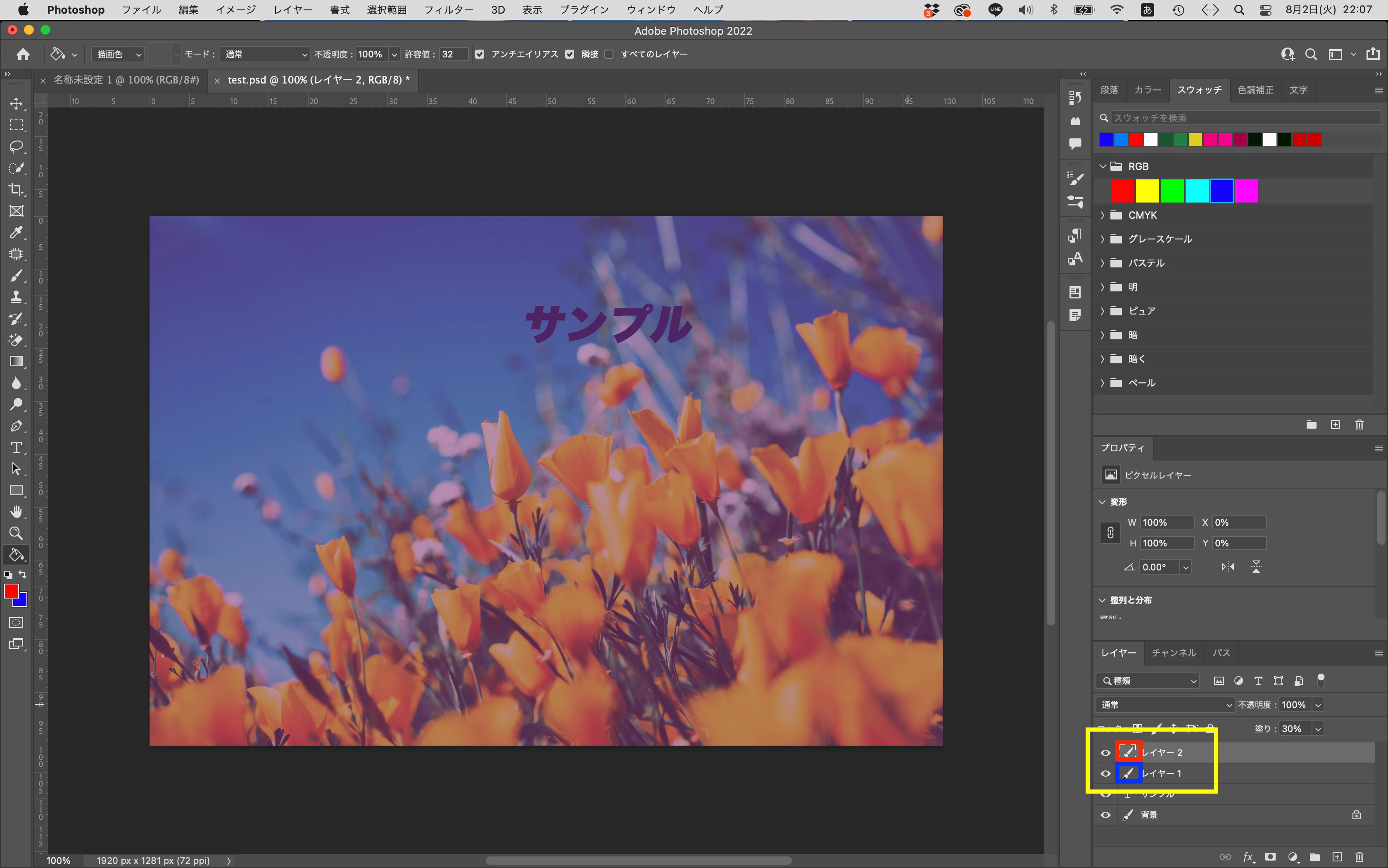 また、レイヤー全面を塗りつぶすなら「塗りつぶしレイヤー」を使う方法があります。