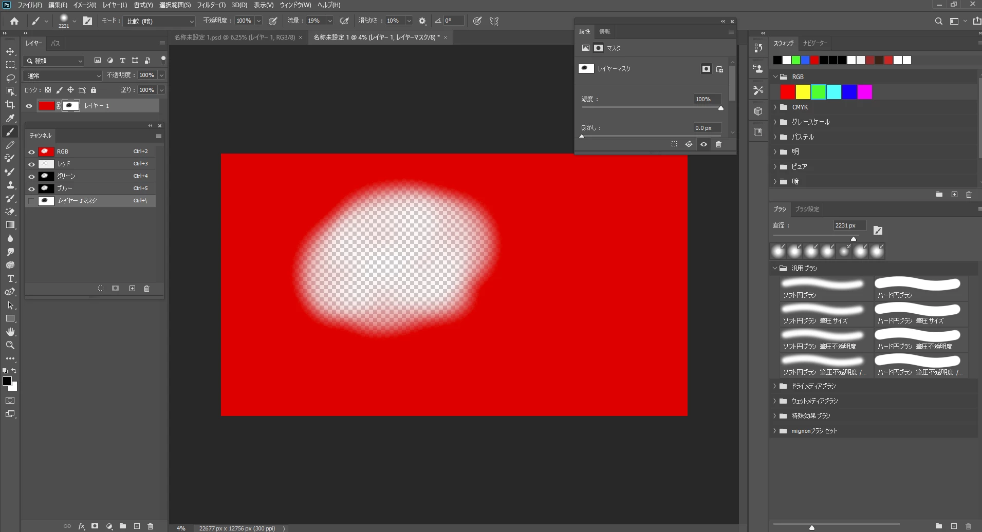 だから例えばレイヤーマスクで黒で塗り過ぎてしまった部分を修正したいとき、白でその部分を塗っても、黒塗りによって透過された状態がもとに戻りません。