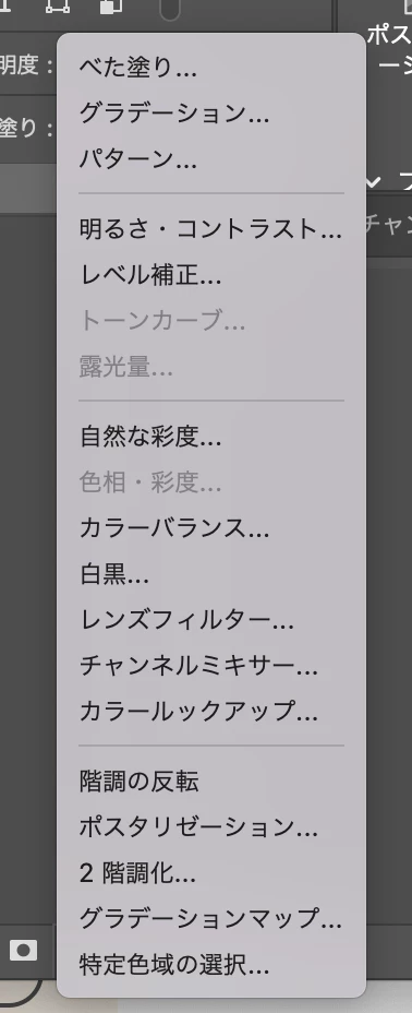 CMYK画像で作業する際、レイヤーパネルの下のメニューボタンから