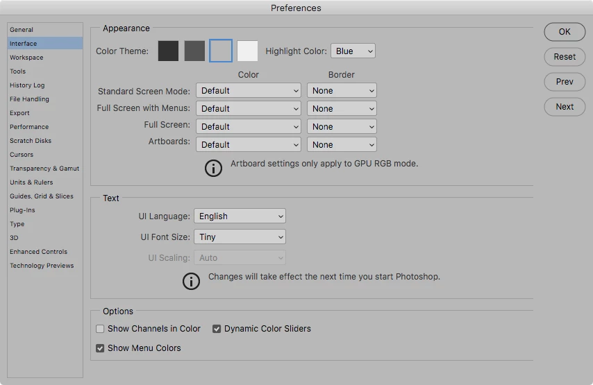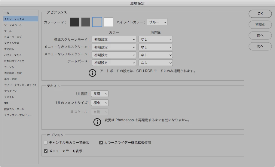 5. Photoshopを立ち上げると日本語で立ち上がるが、環境設定 / インターフェイス / UI言語 で切り替えできるようになっている。