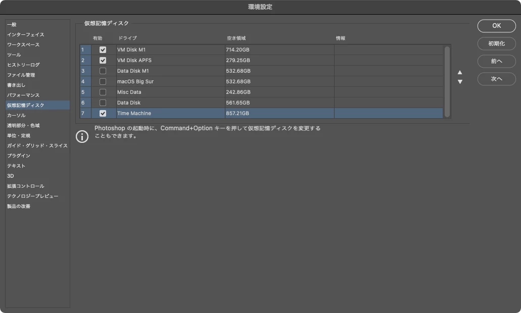 Photoshop2018での起動時に「仮想記憶ディスクの空き容量がありません」と出てしまい、仮想記憶ディスクを外付けのHDDに変更したいと思っているのですが、command+optionキーで記憶ディスクの設定画面を開いても外付けハードディスクが認識されていない状態です。