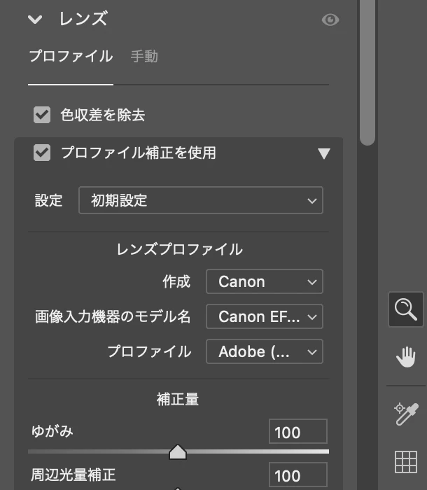 CanonのR5で撮影したRAWデータをPhotoshopで開くと、必ず「プロファイル補正を使用」にチェックが入っていて、画像が歪んでいます(膨張して端が切り落としされています)。毎回そのまま間違えて画像を編集してしてしまいやり直す羽目になるので、初期設定から「プロファイル補正を使用」のチェックを外すことはできないでしょうか?(色収差を除去のチェックもデフォルトで外したいです。。)