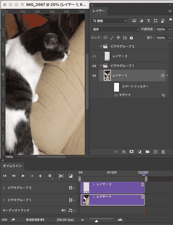 Photoshopに短めの動画を読み込み、それにエフェクトをつけたいのですが、最初の1フレームにしかつきません。