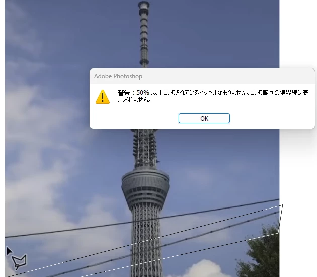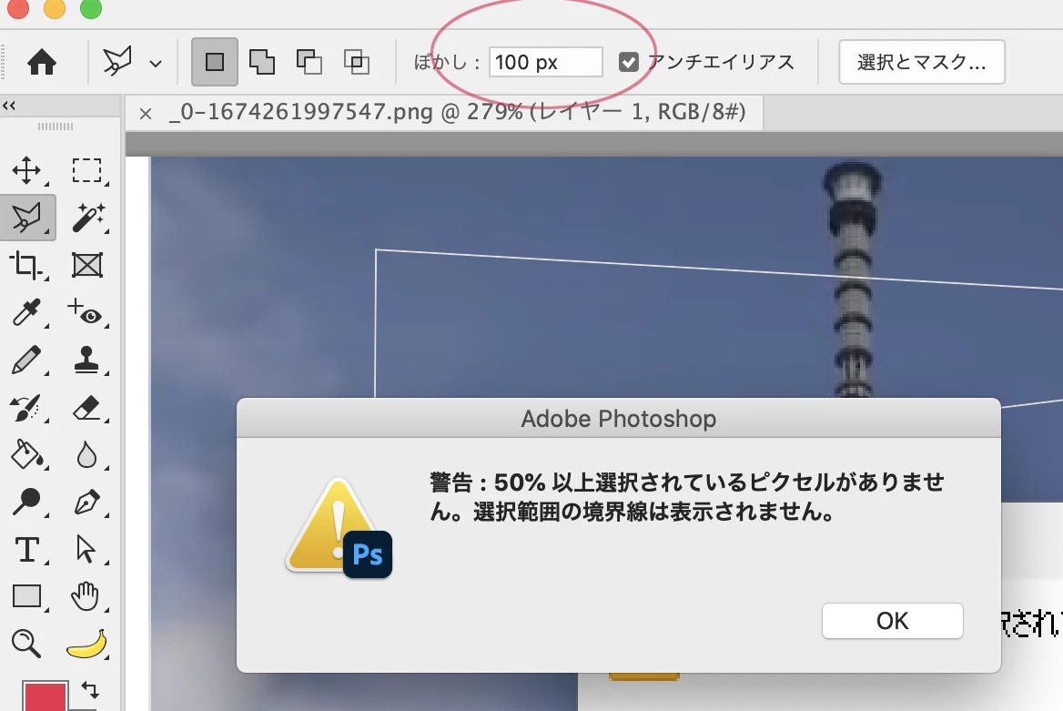 ぼかしに「0」以外の数字が入っていると選択範囲の大きさによってはそのアラートが出ます。