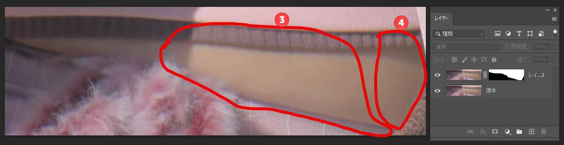 「覆い焼き」は❸の範囲に使っています。でっぱった下腹部分の影とその下の洋服との境目のラインを明るくして、立体感をなくしました。「焼き込み」は❹の範囲に使っています。脇腹の肌の部分の影を濃くして、立体感を強めています。