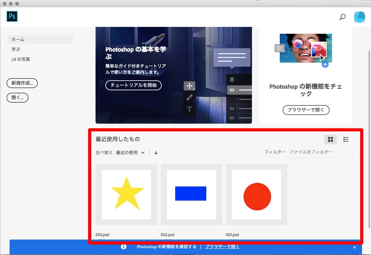 起動時に表示される ホーム画面 で、そこにある 最近使用したもの だとして回答します。