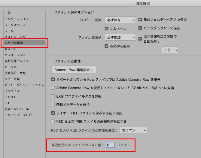 環境設定の ファイル管理 を選択して、最近使用したファイルのリスト数:に「 0 」と入力してOKします。