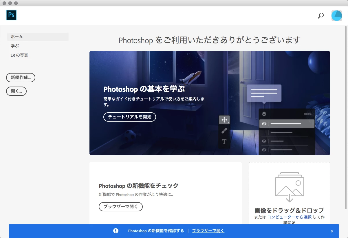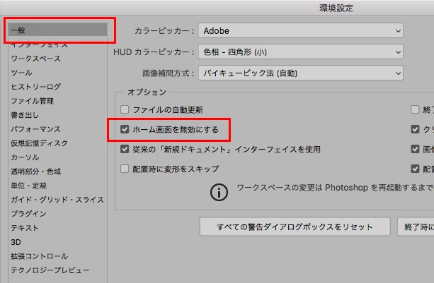 また、ホーム画面そのものを非表示にするには、環境設定の 一般 を選択して ホーム画面を無効にする にチェックを入れてOKし、Photoshop を再起動させます。