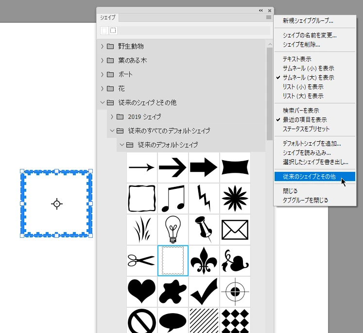 ps2022で従来のシェイプを読み込むボタンが見当たりませんどうして読み込めばいいのでしょうか6角や切手を多用していますので欲しい。