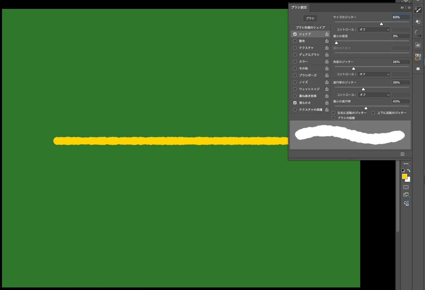 ブラシ設定ウィンドウパネルからシェイプの値を調整します。