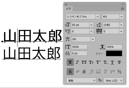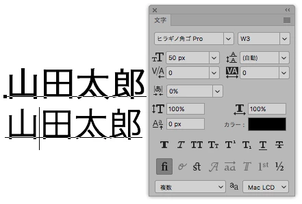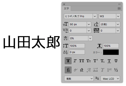 「山田太郎」という文字を下記のように文字パネルで設定します。