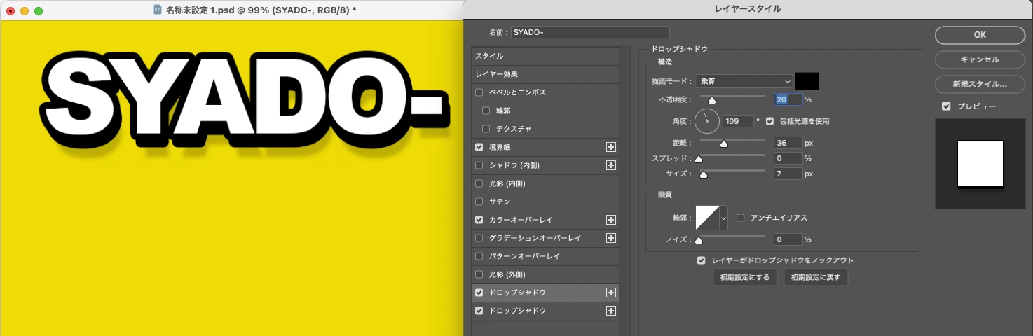 また、このような斜め影文字にドロップシャドウで影を付けることは出来るのでしょうか?
