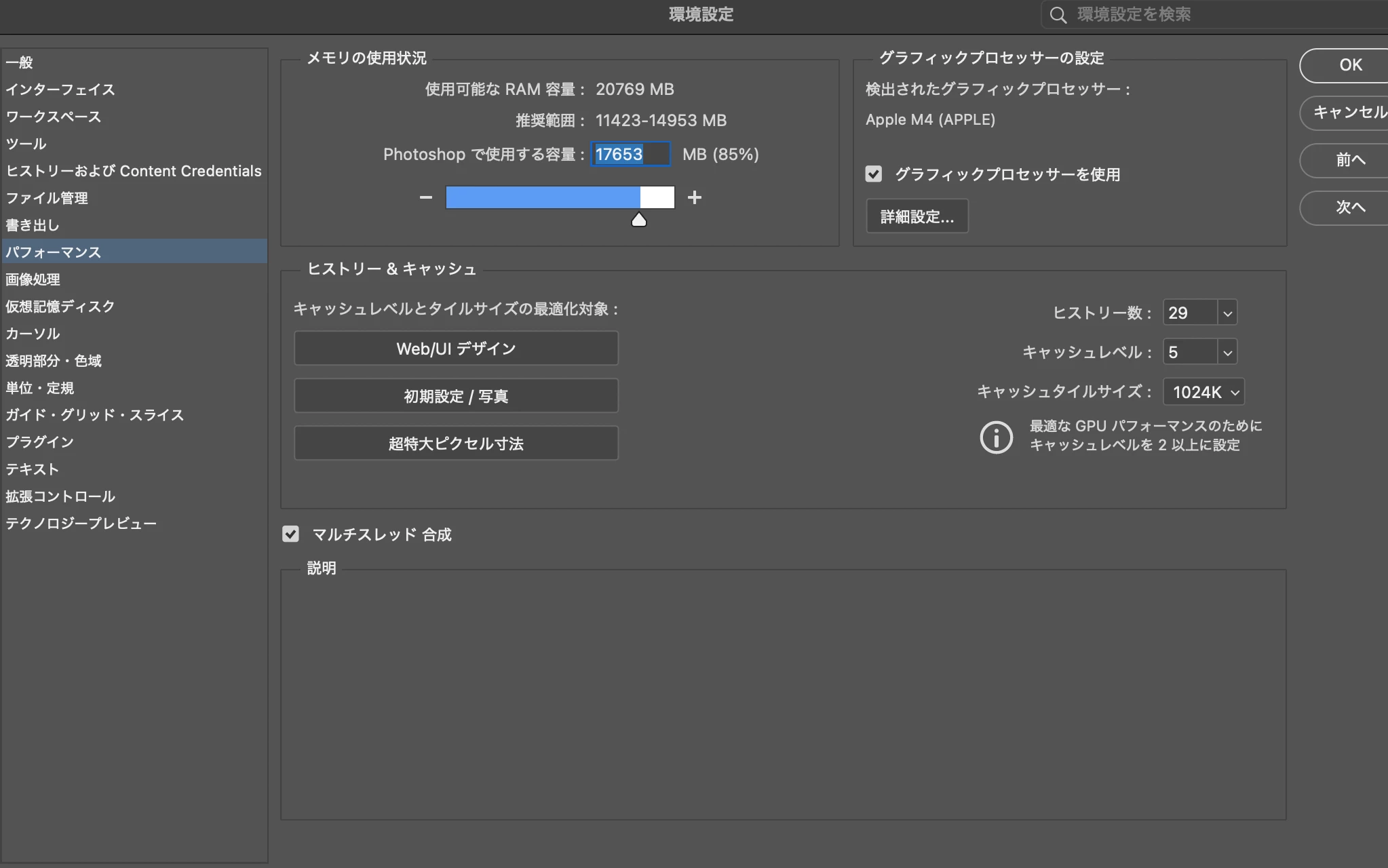 太太郎26346853txbeParticipantForum|Forum|10 months agoMarch 31, 2025Question最新のMacを購入したが、フォトショが重すぎるForum|Forum|10 months agoMarch 31, 20253 replies464 viewsMacスペック:メモリ24GB/容量1TB/M4チップフォトショキャッシュレベル5性能的に問題ないが、フォトショにてアートボード複製する際に重く、30秒-45秒時間がかかる。 取り込んでいる画像が重いのか、性能に問題があるか、原因を知りたいのですがどうすればいいかわかりません。 macOS