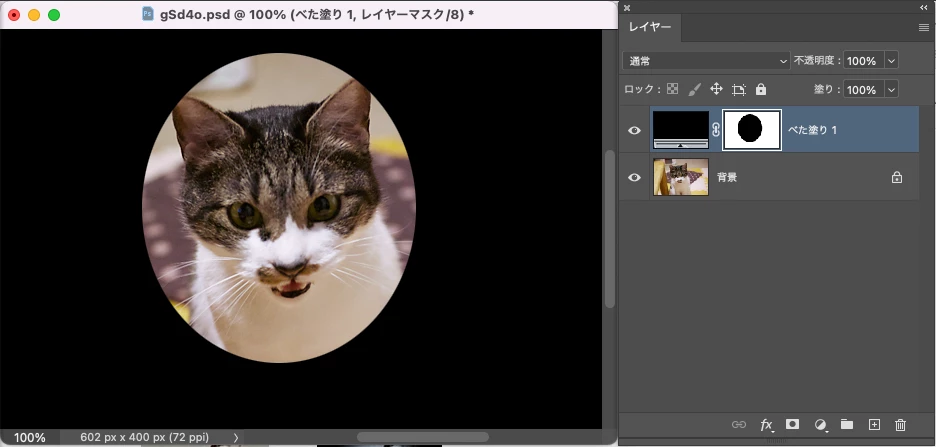 楕円ツールで範囲を指定した後、確かレイヤーの「新規塗りつぶしレイヤー」あたりを使って、どこかの時点で「反転」をさせたはずですが、まったく思い出せません。