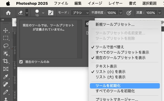 「現在のツールでは、ツールプリセットが定義されていません」と