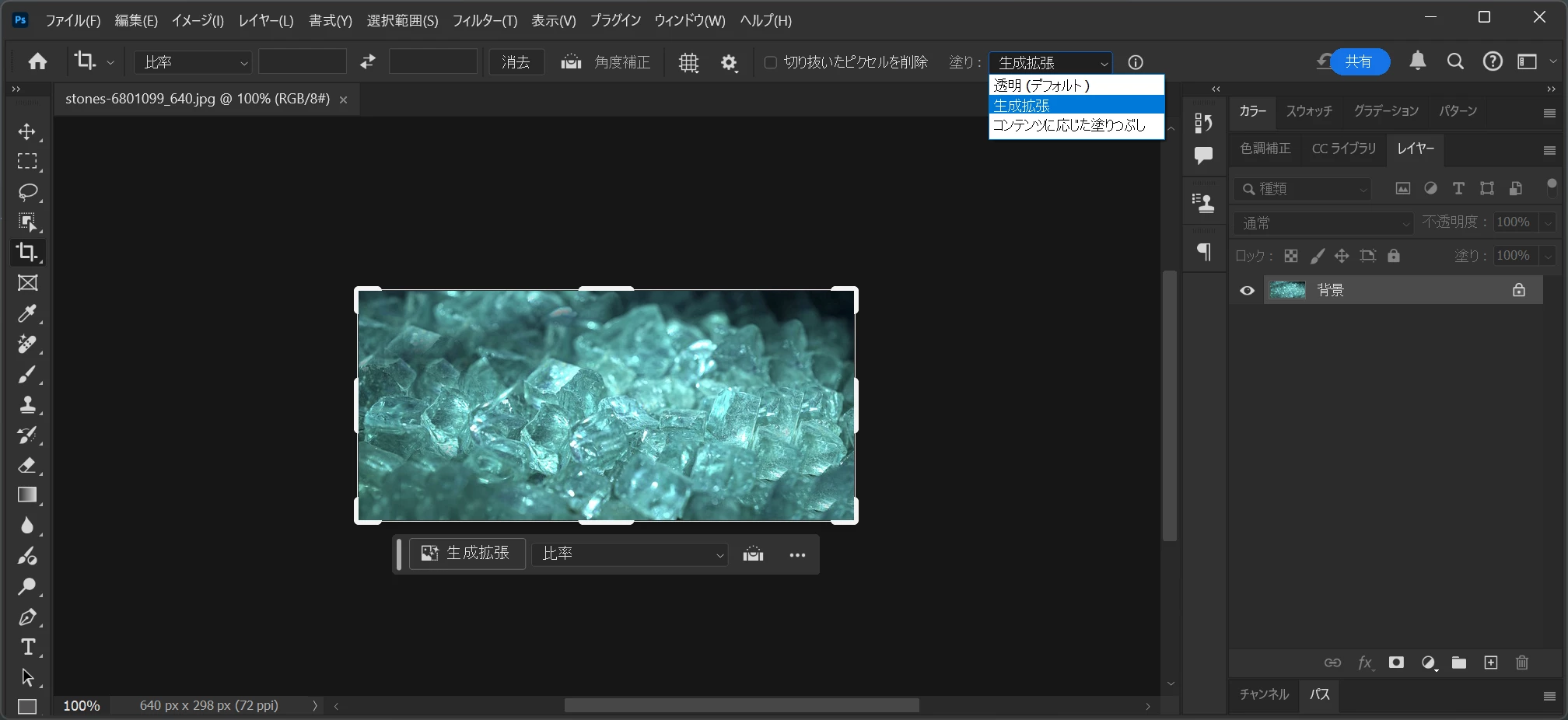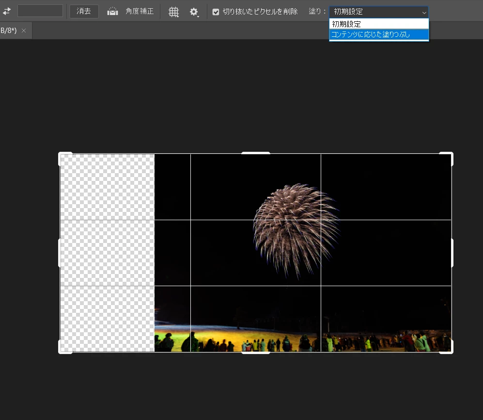 私のマシンでは↓のような感じになり 、塗りのオプションには「透明/生成拡張/コンテンツに応じた塗りつぶし」と表示されます。