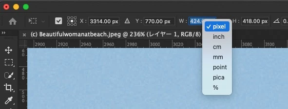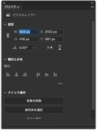 編集>自由変形(あるいはショートカットCtrl+T……Windowsでいいんですよね?)に入ったあと、オプションバー内でプロパティパネルと同様に数値指定します。間にある鎖マーク(縦横比固定)を忘れないようにしてください。