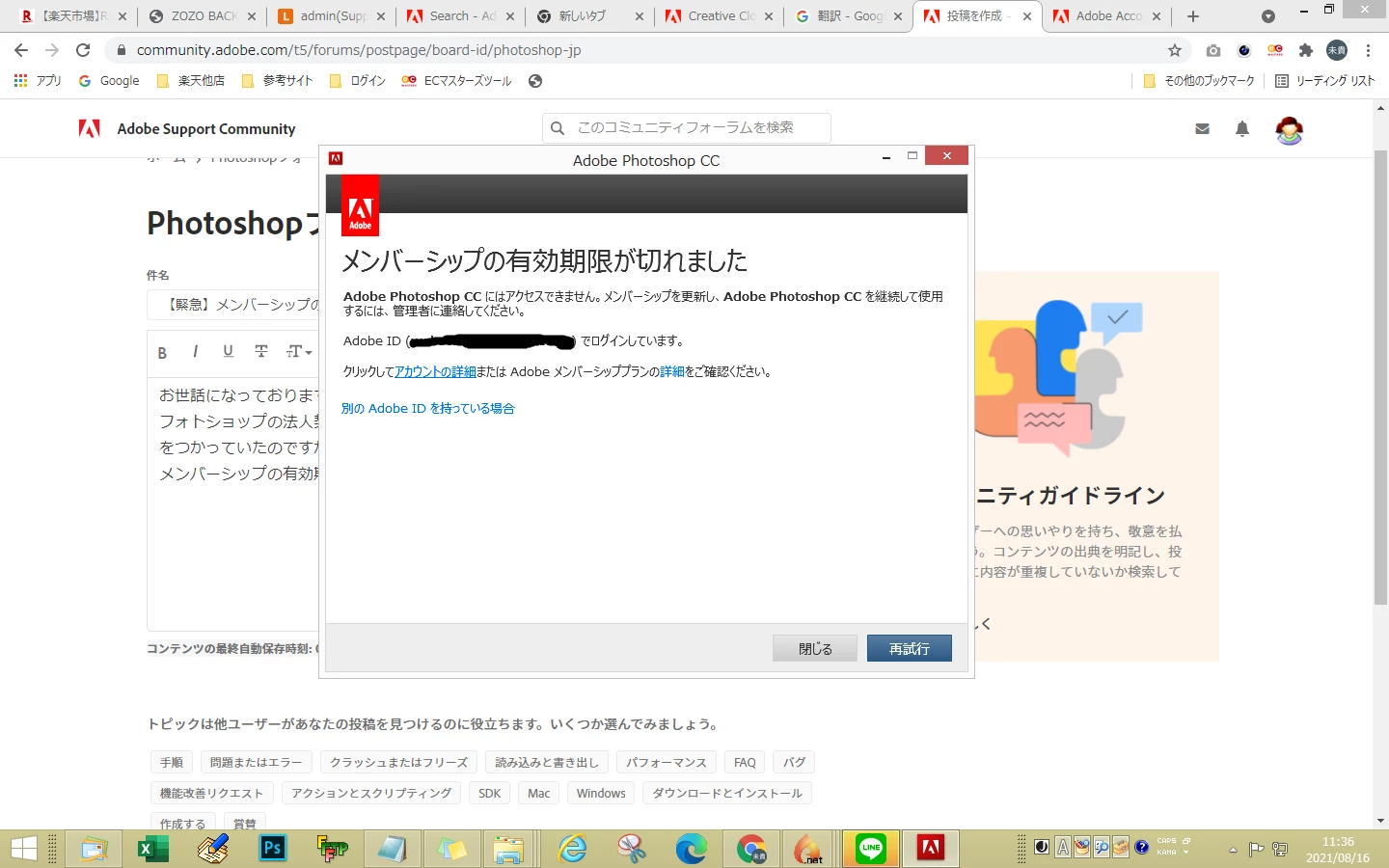 一般的なトラブルの場合、Creatice Cloudデスクトップアプリケーションからサインインアウトで改善する場合があります。
