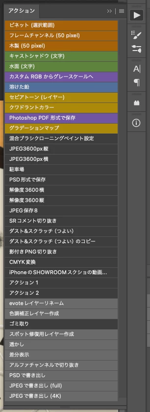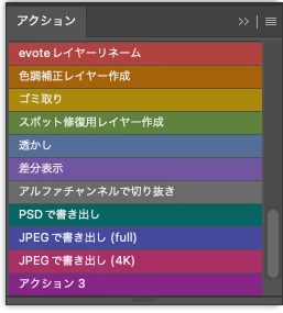 この状態でアクションパレットを「ボタンモード」表示にすると、おそらく先に設定したカラーで各ボタンが表示されるのが正しい状態ではないかと思うのですが、初期設定のアクションはどれもあらかじめ設定された色で表示されるものの、追加したアクションについてはどれも同じグレーでしか表示されません。