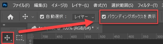 [移動]ツールのオプションの「バウンディングボックスを表示」を使うと、選択するとバウンディングボックスが表示され、変形ができます。