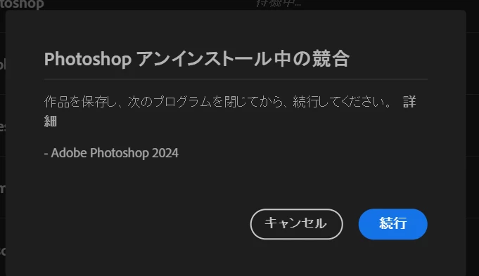 その表示は現在 Photoshop 2024 を使用中だから終了してくださいということです。