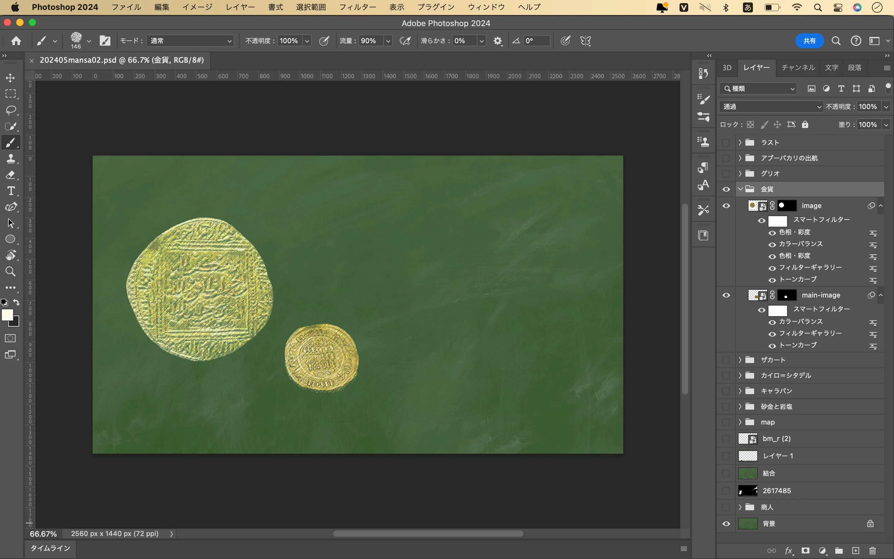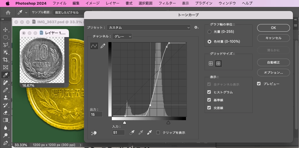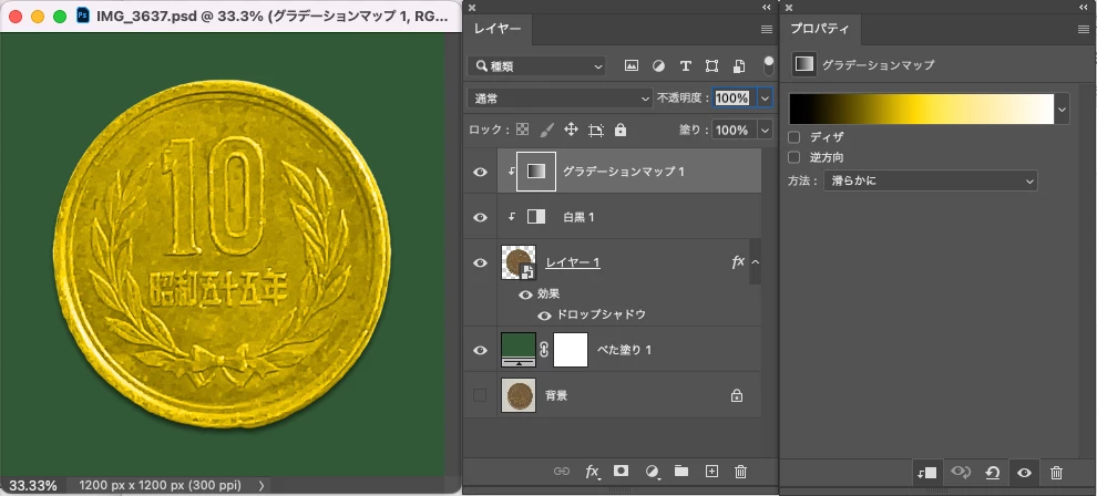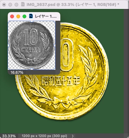 チョークアート風にするために、件のレイヤー「金貨」は描画モードをスクリーンしていました。当方の理解では、描画モード:スクリーンは黒を透過させるものだと考えています。