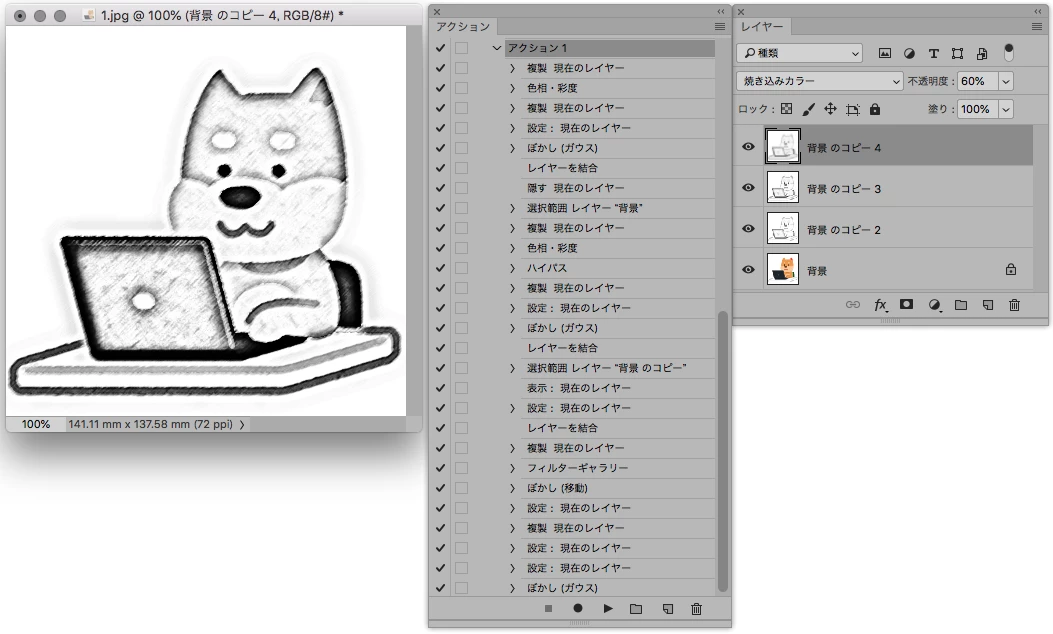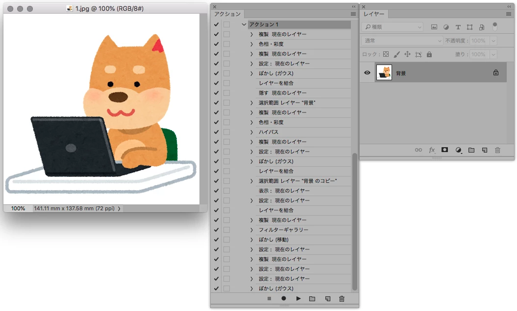 アクションパレットで実行したいアクションを選択して実行ボタン( ▶ )をクリックすれば以下のように一気に処理が完了します。