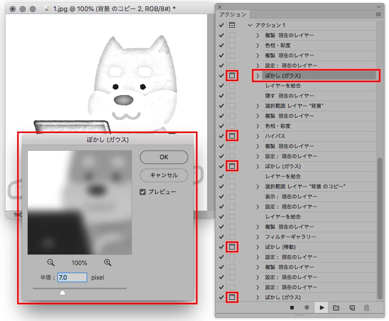 途中、ぼかしやハイパスなどの微調整を行いたい場合は「ダイアログボックスの表示を切り替え」をオンにしておけば、アクションが一時停止して調整のダイアログが表示されます。