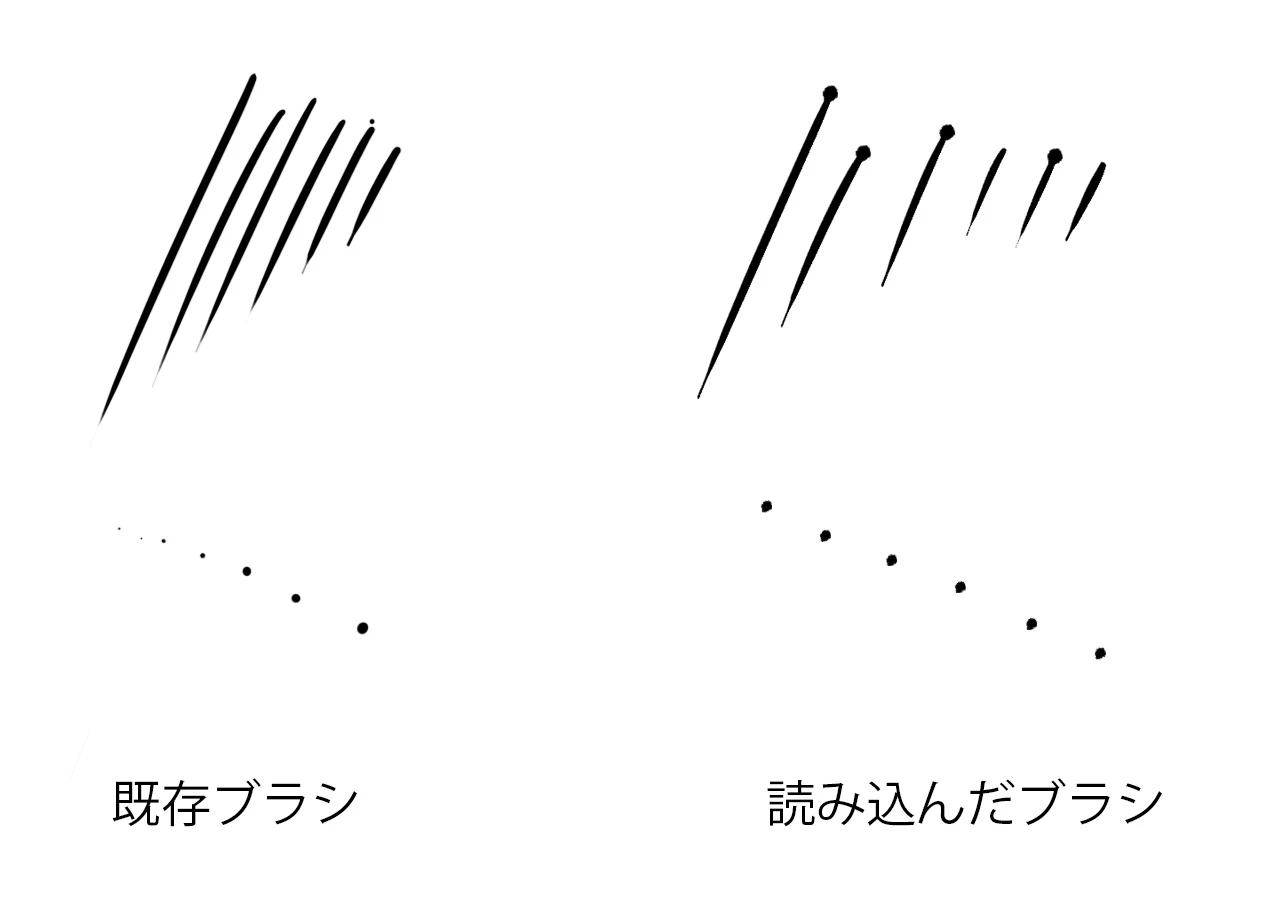 先日Photoshopをアップデートしたところ、読み込んだブラシだけ画像のようにストロークの開始地点(だけ)や点を打つ際に筆圧が無効になってしまい困っております。