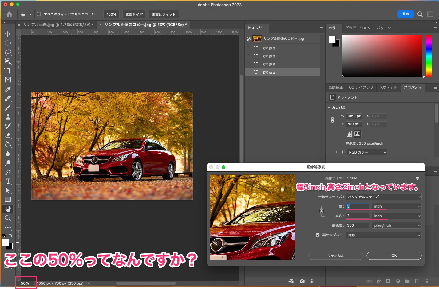 また、質問で示した画像では左下に「50%」とあるため幅1.5inch、高さ1inchになると思うのですが、そんなふうにはみえません。