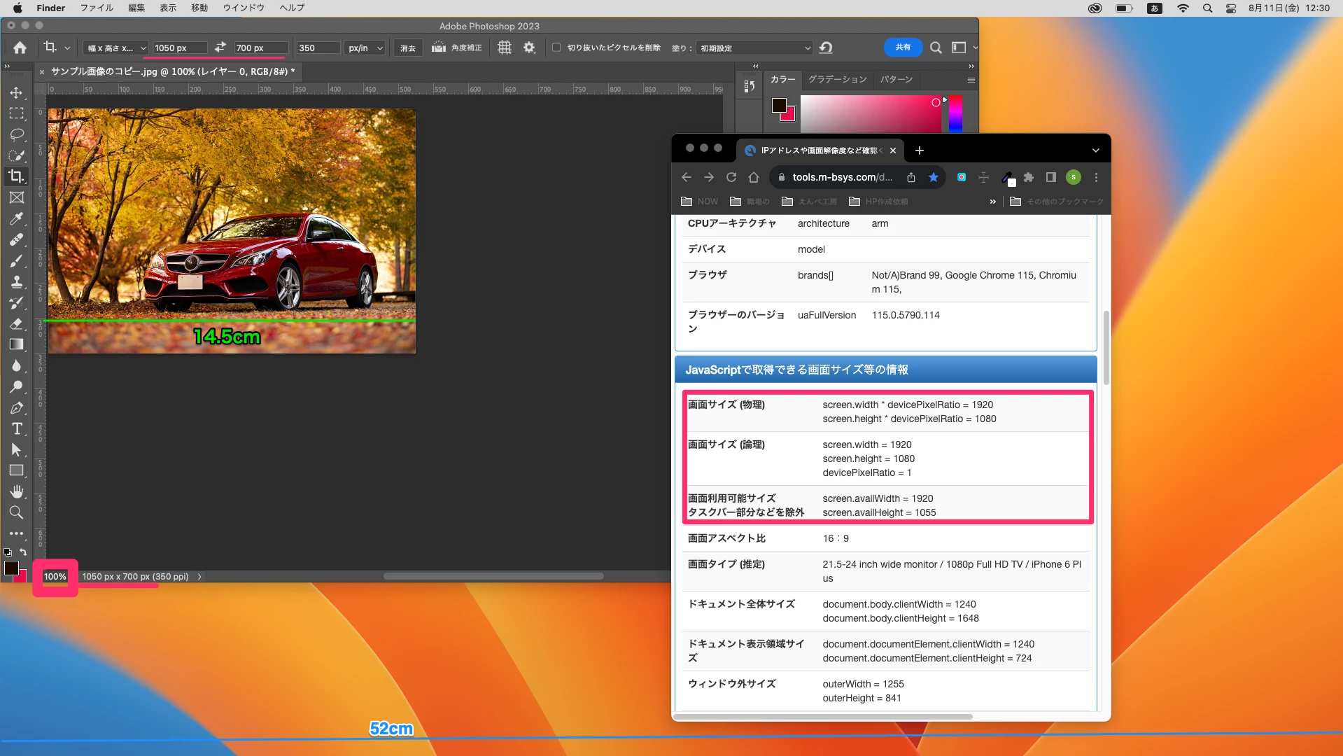 私のパソコンのモニターは幅が52cmあり、ピクセルが1920pxあります。