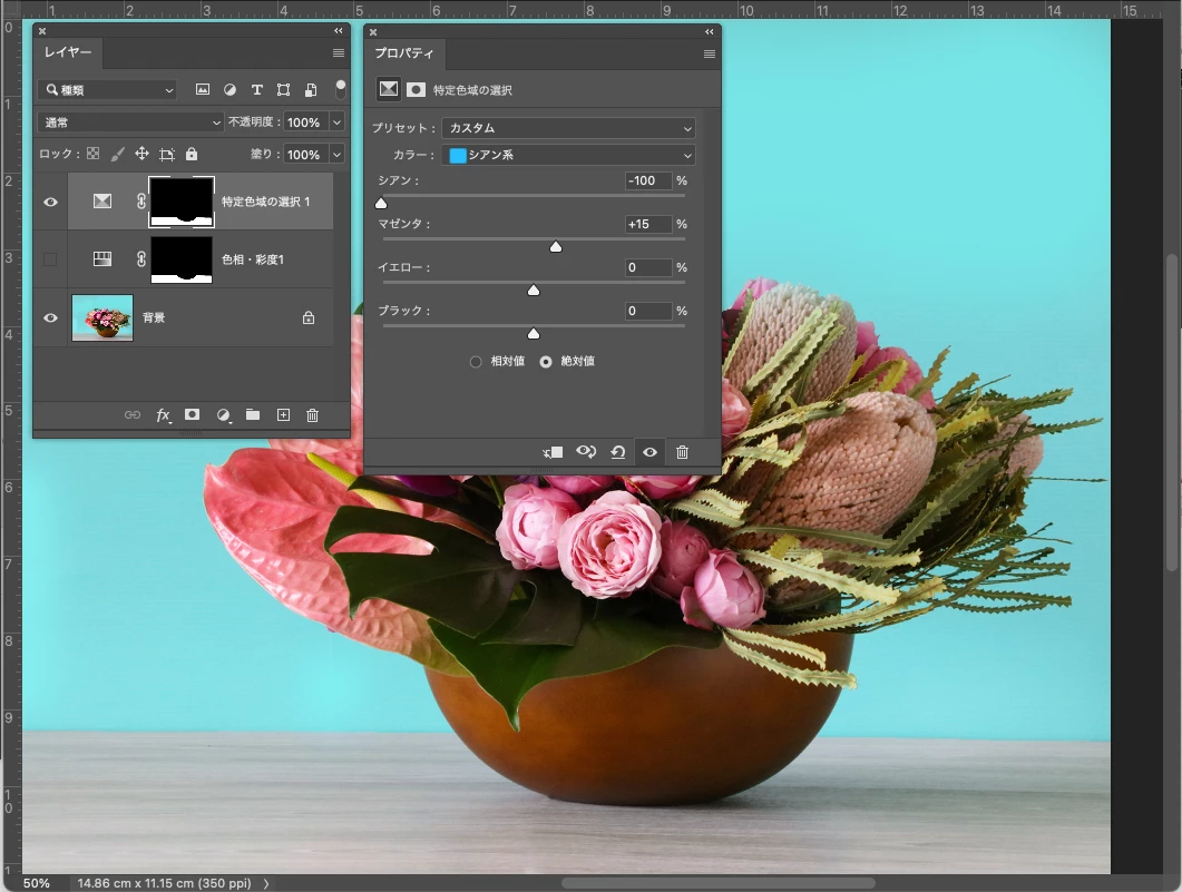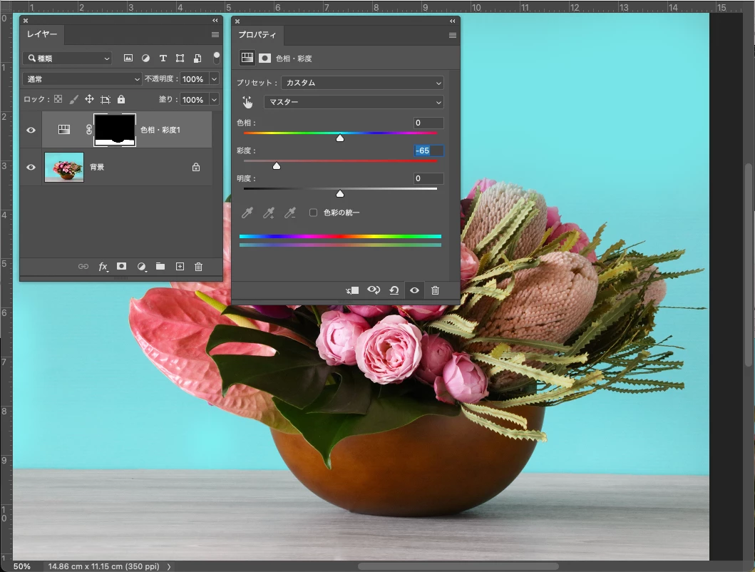 背景のブルーがテーブルに写っていたので、カラーバランスで調整したけれど、中心に赤みが出てしまうので、何か方法はありますでしょうか。MacbookproでPhotoshop2023を使用しています。