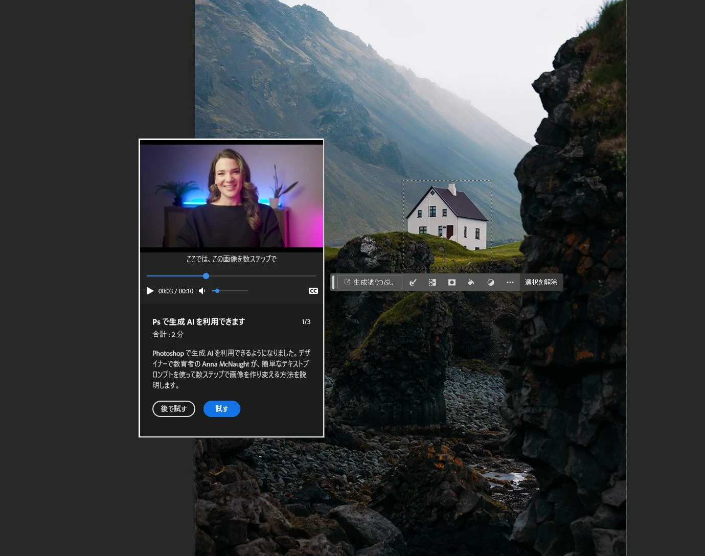 起動時に毎回「生成AIを利用できます」の画面とiceland?という家の画像が起動時に毎回表示されます。