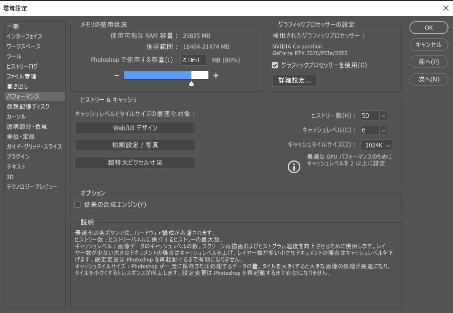 photoshop CCのバージョンは21.0、設定は画像のようにしていて仮想記憶ディスクはそれ用に別のドライブを利用しています。