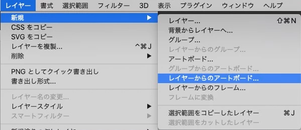 今あるデータを講師と同じようにするには、「背景」レイヤーを選択して、レイヤーメニューの新規>レイヤーからのアートボードを選んでください。