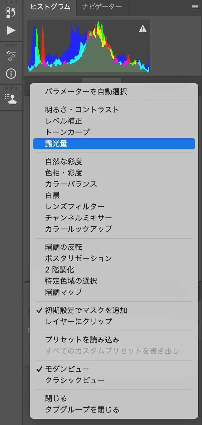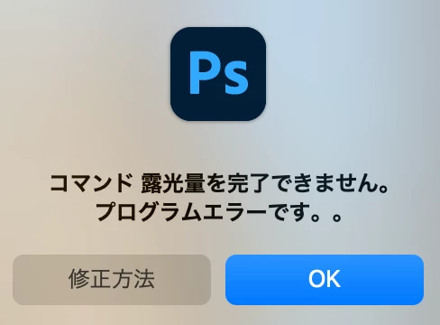 写真右上の4本線から「露光量」をクリックするとエラーメッセージが出てしまいます。